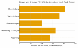 Aktuelle Analysen zeigen, dass mehr als 75 % der PR-Profis 2025 regelmäßig KI nutzen, fast dreimal so viele wie noch 2023. Insbesondere für Textentwürfe, Ideenentwicklung und Medienanalyse. Diese Zahl stammt aus dem Bericht State of AI in PR 2025 von Muck Rack, der die rasante Integration von KI in Kommunikationsprozesse dokumentiert.