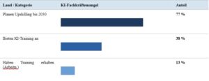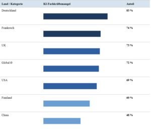 Der Mangel ist nicht gleichmäßig verteilt. Laut ManpowerGroup steht Deutschland mit 83 % Einstellungsschwierigkeiten noch deutlich über dem globalen Durchschnitt von 72 %. In Frankreich sind es 74 %, im Vereinigten Königreich 73 %. Selbst die USA, die als KI-Vorreiter gelten, liegen bei 69 %. China kommt auf 48 % und zeigt damit: Es gibt kein universelles Gesetz, dass KI-Kompetenz immer knapp sein muss.