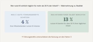C-Suite-Führungskräfte schätzen, dass 4 % ihrer Mitarbeitenden KI für mehr als 30 % ihrer täglichen Arbeit nutzen. Die Realität: 13 % tun es bereits. Das ist das Dreifache der Schätzung. Führungskräfte navigieren in einem Nebel. Sie glauben, wenig KI im Haus zu haben, und treffen Entscheidungen auf dieser falschen Grundlage.