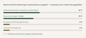McKinsey hat die wichtigsten Gründe für eine zu langsame KI-Einführung erfragt. Die Antworten der befragten C-Suite-Führungskräfte: Fehlende Mitarbeiterkompetenzen (46 %), Ressourcenmangel und Budget (38 %), komplexe Genehmigungsprozesse (8 %) und technische Komplexität (8 %). Auffällig ist, dass regulatorische Hürden in dieser Befragung nicht explizit als Haupthindernis genannt werden, was darauf hindeutet, dass viele Unternehmen die regulatorischen Anforderungen noch nicht vollständig einschätzen können. (Quelle: McKinsey US CxO Survey, Oktober bis November 2024)