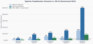 Wichtig zu verstehen: KI ersetzt keine guten Entwickler. Sie multipliziert ihre Leistung. Ein Senior-Entwickler mit Claude Code liefert das, wofür früher ein Team notwendig war. Die Stundensätze bleiben vergleichbar, aber die Stunden, die benötigt werden, sinken dramatisch. KI ist deshalb nicht nur ein Kostenvorteil, sondern auch ein Qualitätsvorteil: Weniger Zeitdruck bedeutet besseren Code.
