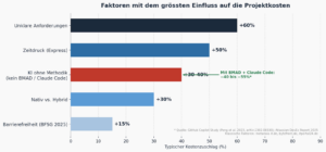 KI kann Projektkosten in beide Richtungen bewegen. Wer KI-Funktionen integrieren möchte, ohne einen erfahrenen Partner zu haben, zahlt Aufschläge von 30 bis 40 Prozent für Research, Prototyping und Spezialkompetenz. Wer dagegen mit einem Anbieter arbeitet, der KI methodisch einsetzt (BMAD-Methode, Claude Code), senkt die Gesamtkosten um 40 bis 55 Prozent. Die Frage ist nicht ob KI, sondern wie. |
