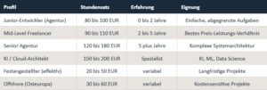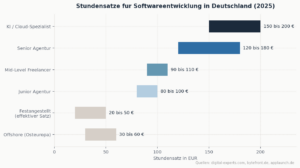 Abb. 2: Stundensätze für Softwareentwicklung in Deutschland 2025 (klassische Entwicklung ohne KI-Einsatz). Quellen: digital-experts.com, bytefront.de, applaunch.de.