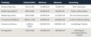 Die folgenden Budgetrahmen basieren auf klassischer Entwicklung ohne KI-Einsatz. Mit methodischem KI-Einsatz, etwa durch die BMAD-Methode und Claude Code, können diese Werte um 40 bis 55 Prozent sinken. Sie geben dennoch den realistischen Marktrahmen vor, weil nicht jeder Anbieter KI einsetzt. Eine mobile App benötigt laut bytefront.de typischerweise 300 bis 800 Stunden, ein E-Commerce-Shop 400 bis 1.200 Stunden. Bei einem Stundensatz von 100 Euro ergeben 300 Stunden bereits 30.000 Euro, und das ist die einfache Version.
